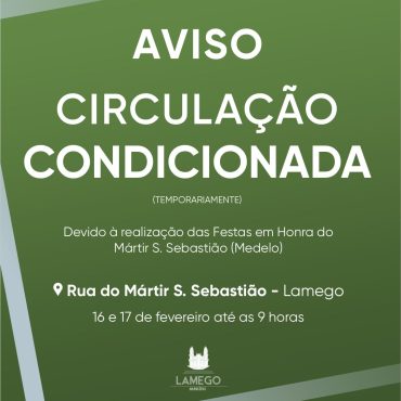 A Câmara Municipal de Lamego informa que, devido à realização das Festas em Honra do Mártir S. Sebastião (Medelo), será condicionada a circulação automóvel na Rua do Mártir S. Sebastião, troço que liga a Capela de Mártir S. Sebastião até ao entroncamento com a Rua da Escola, no próximo dia 16 de fevereiro e no dia 17 de fevereiro, até às 9 horas.   Os automobilistas devem respeitar a sinalização temporária existente […]